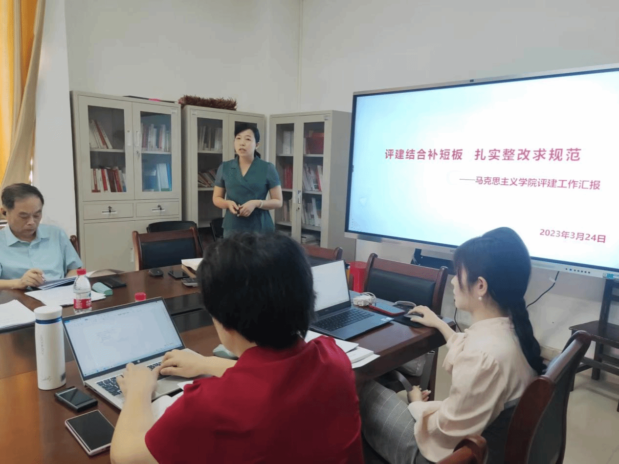 马克思主义学院院长戴彩虹对照本科教学合格评估体系20个二级指标39个观测点的要求以及新时期马院及思政课建设标准等,逐个观测点展开汇报,找寻差距与不足并提出下一步改进措施。