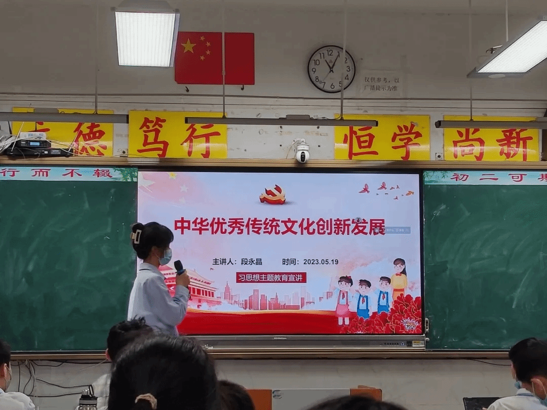 见习活动之前,同学们精心准备了宣讲PPT,并根据指导教师的意见进行修改,最终完成了更贴近中学生学习生活实际的PPT。见习期间,同学们跟班听课并做好听课记录,在听完每节政治课的同时还积极听语文和历史课。同学们还在听课之余与班主任和学生进行沟通交流,充分了解见习班级的基本情况。同学们主动帮助班主任管理班级事务、整顿班级纪律、分析期中考试成绩以及批改作业。周一和周二下午的班会课上,同学们进行学习贯彻习近平新时代中国特色社会主义思想主题教育宣讲,帮助学生进一步了解习近平新时代中国特色社会主义思想主要内容。