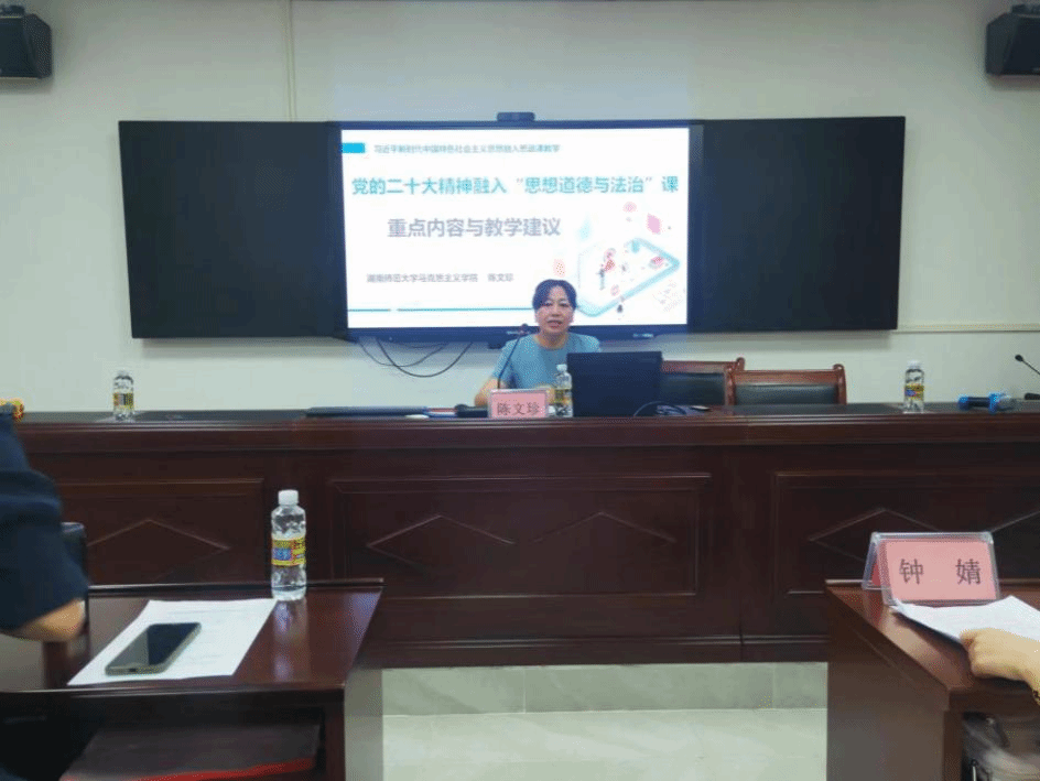 陈文珍教授以“党的二十大精神融入‘思想道德与法治’课重点内容与教学建议”为主题,从融入原则、总体要求、重要内容、教学建议方面,讲述了在“思想道德与法治”课中贯彻落实党的二十大精神,就是要进一步明确立德树人的课程定位,坚持用习近平新时代中国特色社会主义思想铸魂育人,通过对新时代十年的发展历程、重大成就、重要意义、历史经验和使命任务的准确把握,充分挖掘新时代伟大变革中的育人元素,将理论创新、理想信念、价值观念、精神力量、使命任务的教育融贯其间,引导大学生自信自强、守正创新,踔厉奋发、勇毅前行。