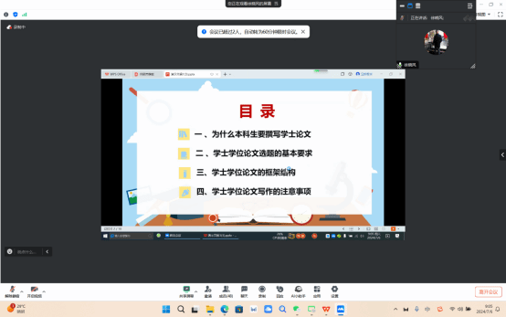 徐晓凤教授从“为什么本科生要撰写学术论文”“学士学术论文选题的基本要求”“学士学位论文的框架结构”“学士学位论文写作的注意事项”四个方面为同学进行毕业论文写作指导。他强调通过撰写学术论文能够提高学生的学术能力、职业竞争能力和综合素质能力,利于大学生将所学知识整合深化,培养独立思考能力、创新能力和学术道德,为研究生阶段打下坚实基础。