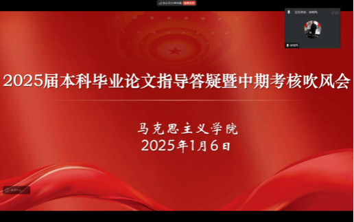 2025年1月7日,马克思主义学院诚邀原哈尔滨师范大学原副校长、博士研究生导师徐晓风教授为2025届思想政治教育专业本科生作毕业论文指导。钟婧副院长、班主任廖子清、王海玲老师线上参会。会议由副院长刘澈主持。