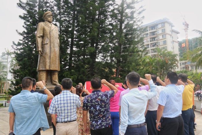 在张云逸大将铜像前,全体成员列队,高举党旗,重温入党誓词。宣誓结束后,党员们参观了陈列室,在张云逸大将生平陈列室,大家进一步感受张云逸大将的红色革命传奇人生。一幅幅图片再现了当年的艰苦岁月,诉说着张云逸大将为党的事业浴血奋战的光辉事迹,以及老一辈无产阶级革命家坚定的共产主义信念和大无η的革命精神。通过此次主题党日活动,党员干部教师缅怀革命先辈,重温红色记忆,更加坚定了大家学习先辈为党的事业奋斗终身的理想信念,在海南自由ó易区(港)建设中扛起责任担当,勇当先锋,做好表率。